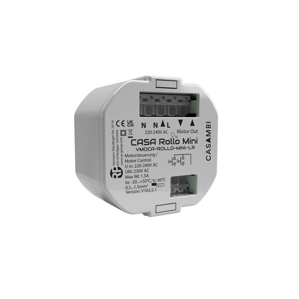 De CASA ROLLO Mini-module is een module die speciaal ontwikkeld is voor inbouwinstallatie en biedt je een comfortabele bediening van rolluiken, zonweringen of jaloezieën via de configureerbare drukknoppen of de praktische Casambi app.